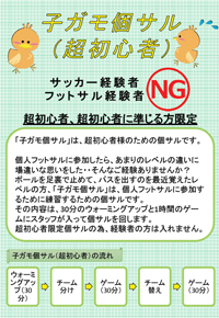 ボールを足裏で止めて、パスを出すのを最近覚えたレベルの方、「子ガモ個サル(超初心者)」は、個人フットサルに参加するために練習するための個サルです。その内容は、30分のウォーミングアップと1時間のゲームにスタッフが入って個サルを回します。